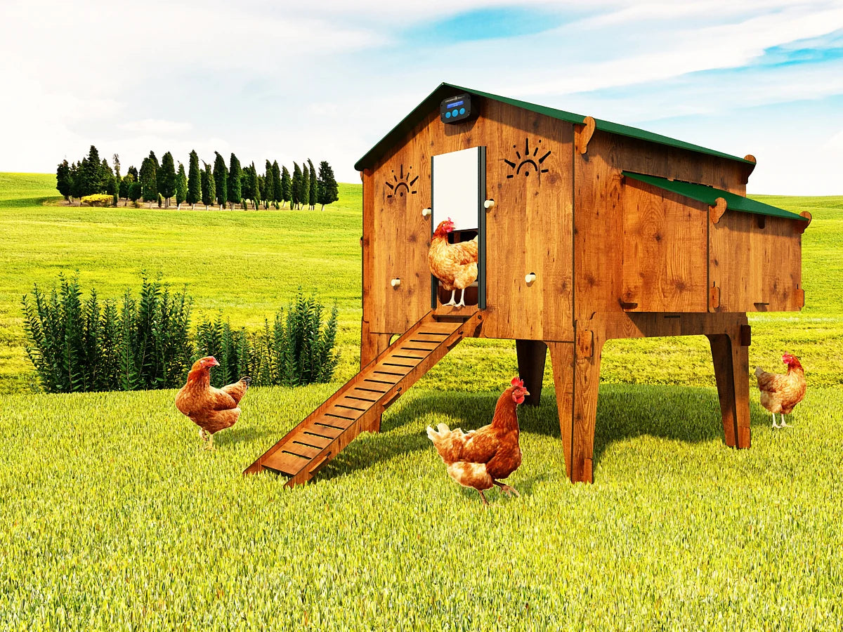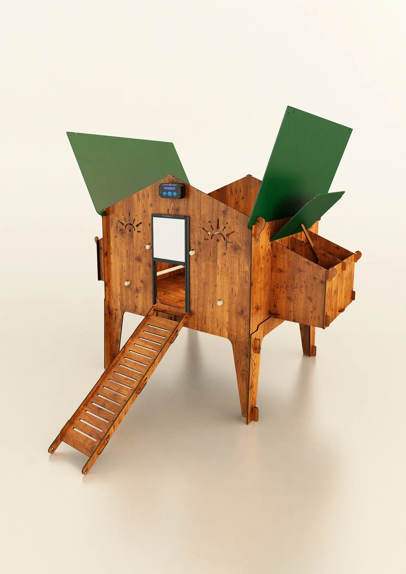 Traditional design; cleaning via flip up roof, on legs. Dimensions: 1950mm x 1200mm x 1420 (WxDxH). Revolutionary design; easy clean, assembly, storm resistant, long-lasting & good-looking. 10 yr Warranty. Eco-friendly, mite-proof HPL. Ideal for breeders, great for mature egg layers. Capacity: 15-20 large birds (1/2sq ft). Maintenance-free. Cleaning: disinfectant as needed. 28x25cm pop hole door w/ Chicken guard locking. 4 external nest boxes, 4 perches. Ventilation front & rear. 25+ yrs life. Flat-pack: 140x110x20cm, 90Kg.